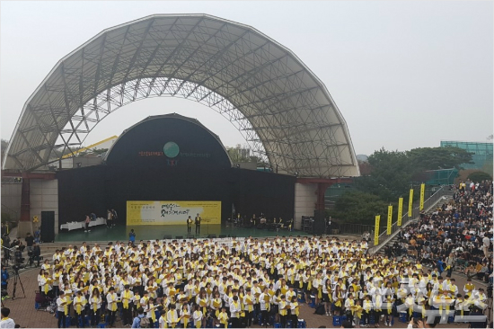 예배를 드린 화랑유원지 원형극장은 앉을 자리가 부족해 서서 예배를 드린 이들도 많았다. 예배에 참석한 기독인들은 부활하신 예수님처럼 세월호 참사의 진실도 드러나길 기도했다.