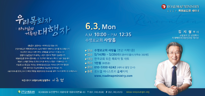 수영로교회(이규현 담임목사)가 한국교회의 젊은 목회자들을 위해 매달 개최하는 6월 목회 로드맵 세미나가 6월 3일 오전 10시에 수영로교회 사랑홀에서 "하나님의 거룩한 대행자 : 우리 목회자"라는 주제로 열린다.